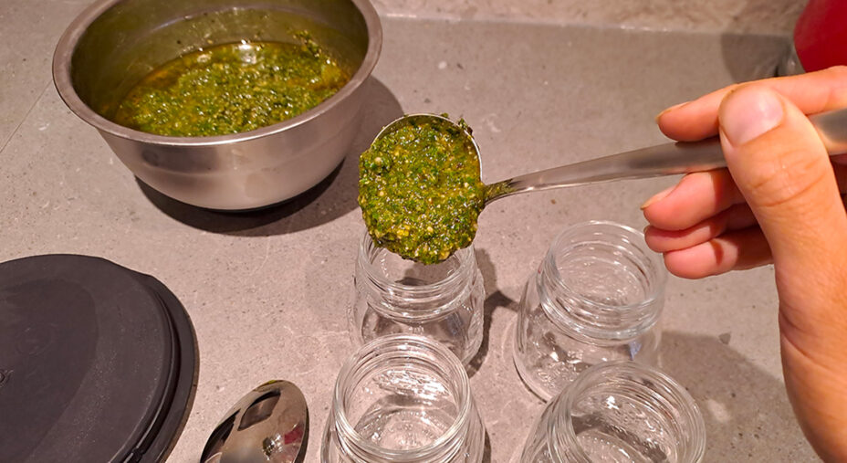 Tra le preparazioni in cui il basilico è protagonista, bisogna citare il pesto. Questo delizioso condimento può essere congelato in vasetti, per poi essere utilizzato, a seguito di un lento scongelamento in frigorifero, per arricchire un piatto di pasta. La preparazione è semplice ma bisogna fare particolare attenzione per mantenerne il colore verde brillante, evitando eccessi di temperatura e l’esposizione all’ossigeno. Questi fattori accelerano il processo di ossidazione dei polifenoli e, di conseguenza, si otterrà un pesto dal colore spento.
