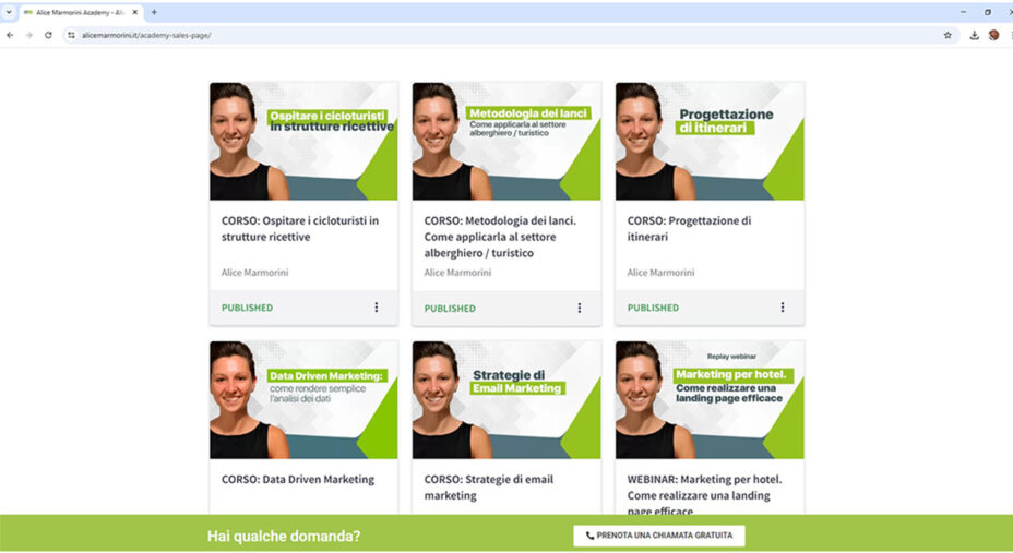 Ci sono entrambe le soluzioni, sia offline che online. Abbiamo un’academy dove seguiamo più albergatori, piuttosto della formazione one-to-one. Sul sito c’è anche la possibilità di acquistare dei videocorsi su vari argomenti. Spesso aggiungo contenuti a partire proprio dalle esigenze e dagli spunti che mi danno gli albergatori.