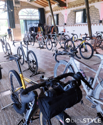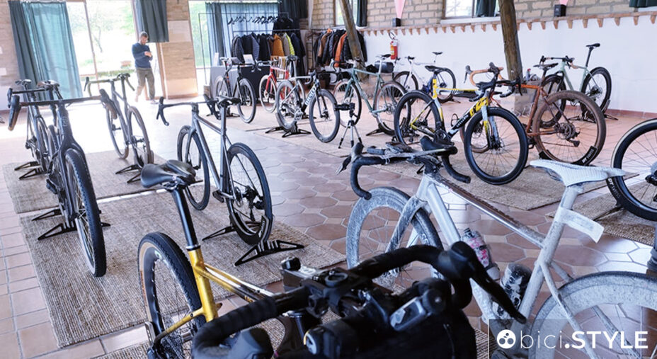 Proprio nello sterrato al fianco del nostro agriturismo, la splendida Fattoria Pieve a Salti, 48 ore prima erano sfrecciati i campioni e le campionesse. E 24 ore prima erano sfilati gli oltre 8.000 appassionati della GF Strade Bianche. Alcune bici erano anche esposte ai Craft Bike Days Italia… tutte volutamente ancora lasciate sporche. Con quella terra ocra secca a dipingere il telaio.