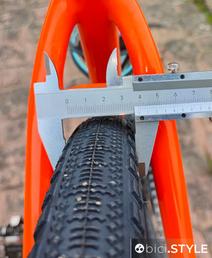 Tende a perdere 1 o 2 millimetri. Le abbiamo provate su un cerchio hookless con canale interno da 25 millimetri. Abbiamo rilevato una larghezza dello pneumatico di 39 millimetri. Cosa significa? Significa che bisogna tenere conto del disegno (anche per il gonfiaggio), ovvero uno pneumatico gravel parecchio arrotondato su tutta la superficie occupata dal battistrada.