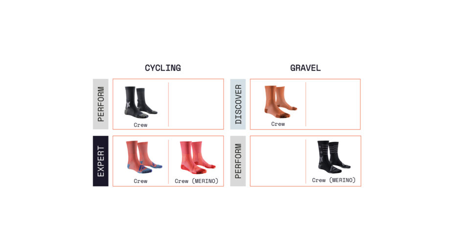 Per la stagione 2024, X-Socks ha deciso di riclassificare e rinnovare le proprie collezioni, dividendo le calze in tre categorie: Discover, Perform ed Expert.