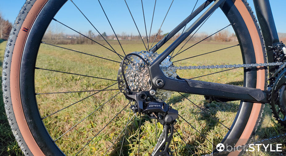 Telaio e forcella in carbonio (un blend di fibre lavorate con tecnologia monoscocca), attacco e manubrio in alluminio, così come il reggisella, tutto X-Feel. La sella è una San Marco GND. La trasmissione è Shimano GRX 2×12 di matrice meccanica (che funziona a meraviglia) 48/31 e 11/36. Anche l’impianto frenante è GRX con cerchi da 160 di diametro. Le ruote sono il risultato di un assemblaggio che ha l’obiettivo di dare sostanza e contenere il prezzo. Cerchio in alluminio X-Feel tubeless ready e mozzo Shimano. Le coperture sono Schwalbe G-One Bite TLE (tubeless). Il peso rilevato è di 9,8 chilogrammi (senza pedali). 2585 euro di listino.