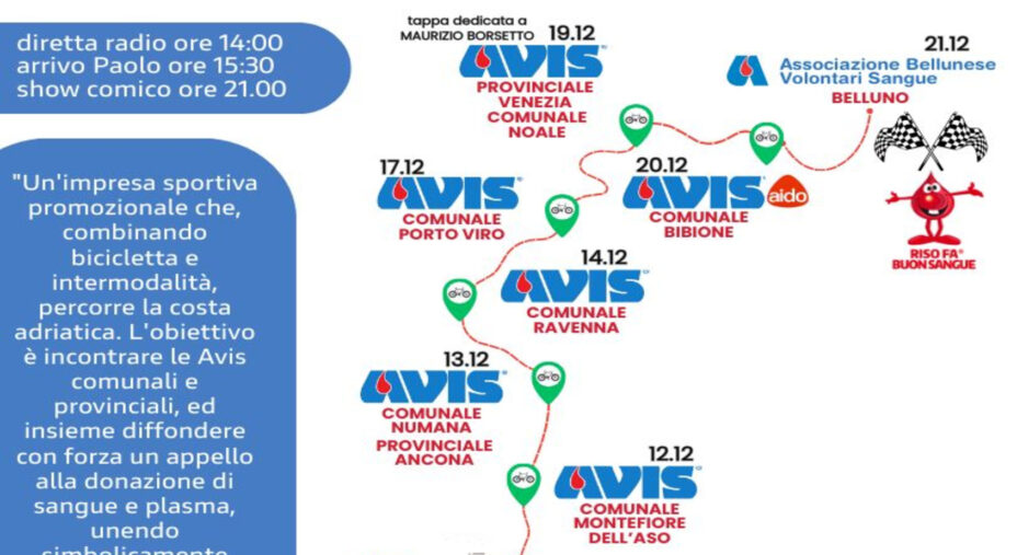Pedalare per settanta chilometri al giorno e, la sera, trasformare la fatica in risate. E’ questo il ritmo del viaggio che Paolo Franceschini, comico, ciclista per passione e ormai noto sui social come “Il Comicista”, sta portando avanti in questi giorni lungo tutta la costa adriatica, da Santa Maria di Leuca (Lecce) a Belluno (l’arrivo è previsto il 21 dicembre). Un itinerario di oltre mille chilometri chiamato Avis Bike Tour, nato all’interno di “Riso Fa Buon Sangue”, progetto che unisce spettacolo e sensibilizzazione sulla donazione del sangue. Ogni tappa prevede l’incontro con le sedi Avis locali nel pomeriggio e uno spettacolo di cabaret la sera, spesso in contesti improvvisati, sempre accolto con entusiasmo. Lo abbiamo raggiunto a Termoli, nel pieno del tour.