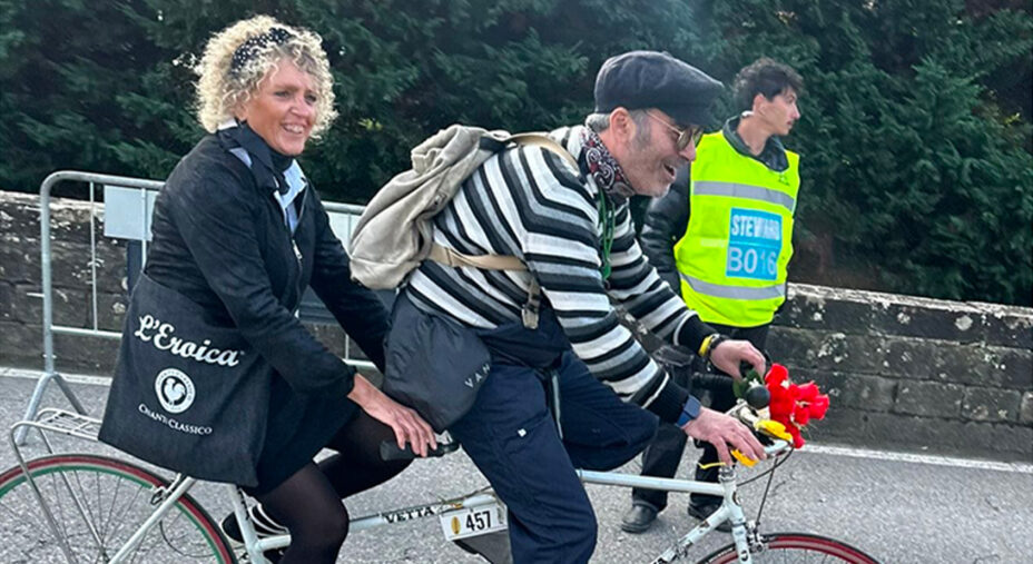 «Lui si chiama Fabio ed è un fanatico dell’Eroica. Mi ha fatto conoscere Brocci, mi ha fatto conoscere un sacco di gente, ma il primo anno andai solo a fare fotografie. Poi ho iniziato a iscrivermi e ormai da anni la faccio in tandem con lui. Diciamo che lui pedala e io faccio quello che posso. Il giorno prima Fabio fa una delle prove più lunghe, mentre il giorno dopo poi si sacrifica per me, ma si diverte. Anche perché ci vestiamo sempre in maniera un po’ bizzarra, per cui anche la preparazione diventa divertente».