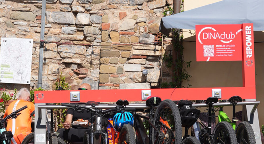 Prima di raccontare le tre belle avventure in giro per il Bel Paese è giusto specificare che cosa sono le postazioni DINA. Repower ha progettato, grazie allo studio Makio Hasuike che ha vinto il Compasso d’Oro, massimo premio nel settore del design, una serie di rastrelliere, con 5 postazioni ognuna di cui 3 per la ricarica della batteria e le ha poi distribuite in giro per l’Italia. Come? E’ presto detto: numerosissime strutture, fra ristoranti, bar, alloggi, ritrovi hanno scelto di entrare a far parte della rete DINAclub. Attraverso di essa tantissimi cicloturisti costruiscono i loro viaggi dai quotidiani a quelli di più giorni. Sanno così di poter contare su luoghi dove poter ricaricare agevolmente la propria E-bike. Non solo: facendolo nelle postazioni DINAclub si acquisiscono punti utili a poter scaricare gratuitamente itinerari komoot altrimenti a pagamento.