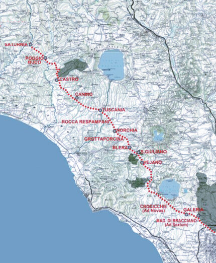 Superata Blera, entriamo nel cuore della Tuscia. Ora i saliscendi sono decisamente marcati. Si superano boschi come quello della riserva di Manziana e noccioleti. Uliveti e i primi campi della Maremma. Man mano che si procede ci si lascia a Nord Ovest il Lago di Bolsena. Da queste parti c’è un vino decisamente imperdibile. A dirlo per primo fu un vescovo del 1100, è l’Est! Est! Est! Al primo borgo approfittatene. Magari entrando a Tuscania, uno dei capisaldi della Via Clodia.