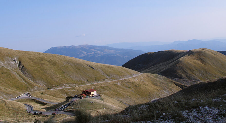 A questo punto, con una secca svolta a sinistra, si entra nell’ultima tranche. La strada cambia all’improvviso. E’ stretta poco dopo sparisce la vegetazione, quei faggi che ci avevano accompagnato per tutto il tempo. Mancano sei chilometri alla cima e la strada è un leggero falsopiano. Solo ai 2,5 chilometri dal termine riprende a salire. E lo fa in un modo netto: 8-10 per cento. Adesso sembra di essere in alta quota. I tornanti, un rifugio, l’aria più fina. Si aggira la Cresta Sassetelli, la cima del Terminillo e con una lunga curva verso destra all’improvviso ci si ritrova in vetta ai 1.901 metri del valico più alto dell’Appennino.